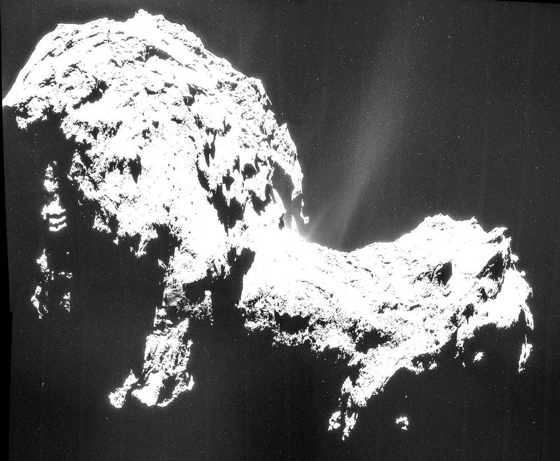 Добавлено (19.09.2014, 22:33) --------------------------------------------- Свежий снимок (мозаика) кометы 67P. Немного зашкалил параметры, чтобы были видны активные струи на перешейке и на бОльшем полушарии ядра